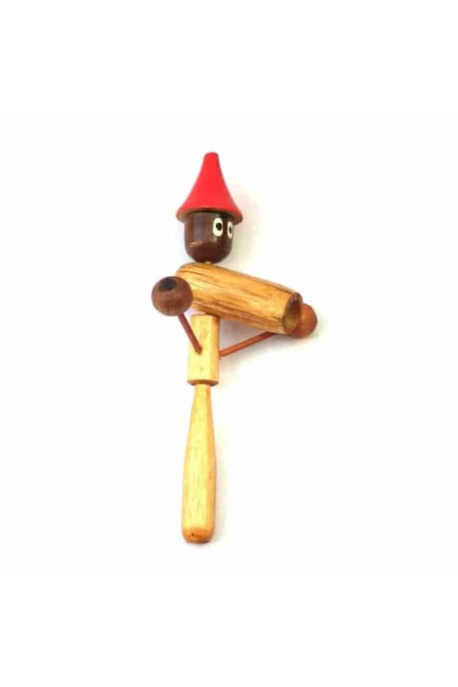 This wooden clacker is in the shape of a man with a hat. Twisting it around creates a great clacking sound. Great for kids.