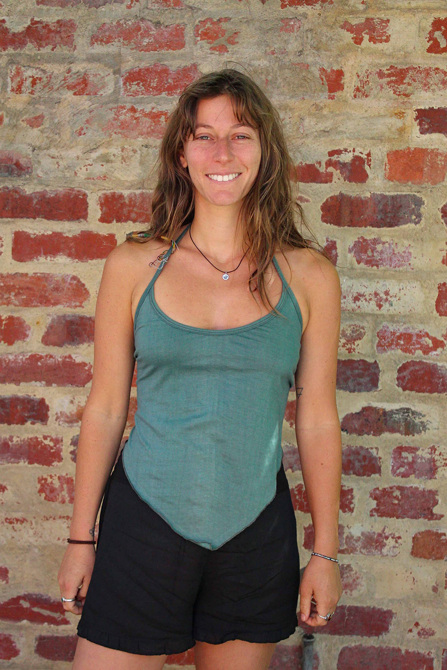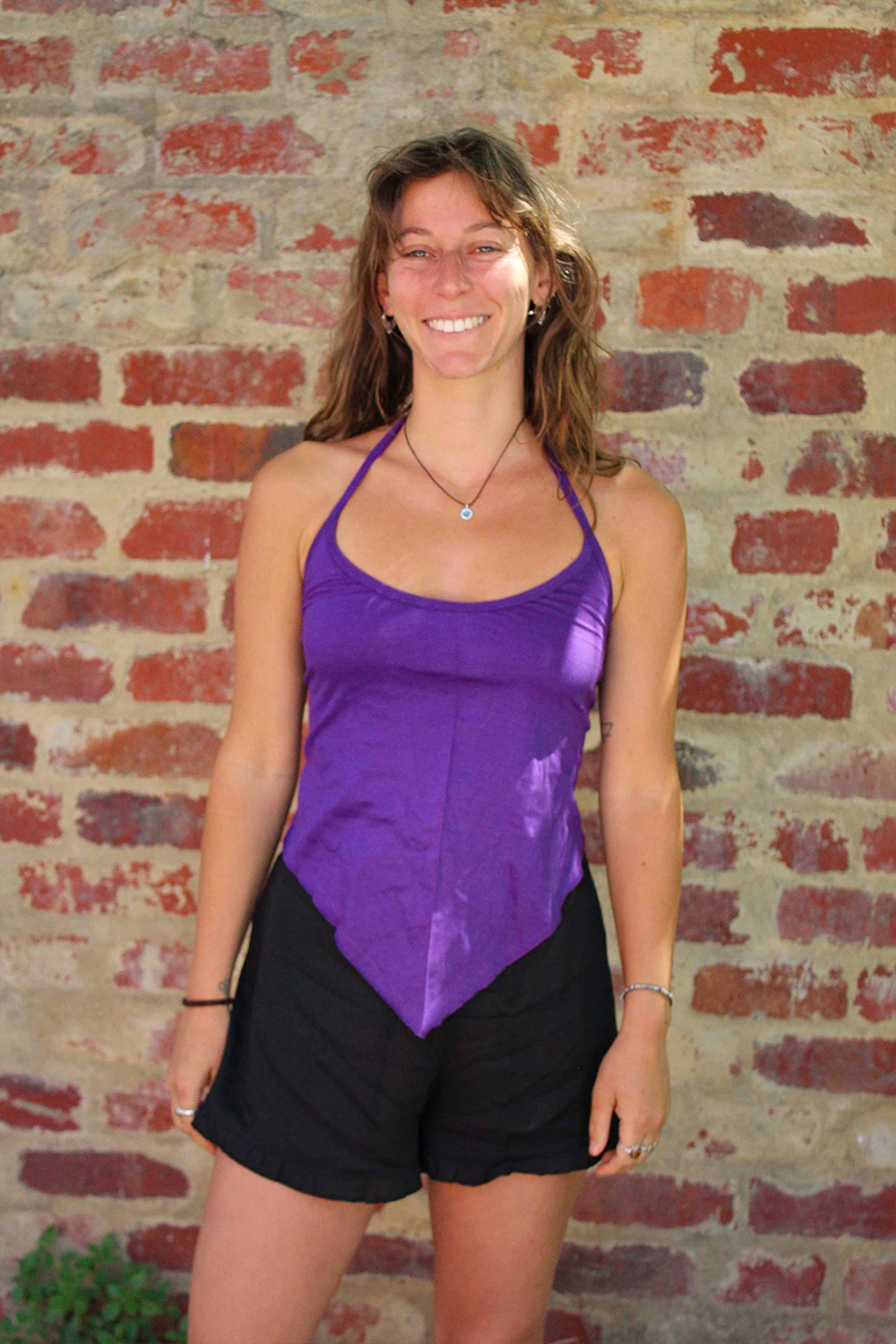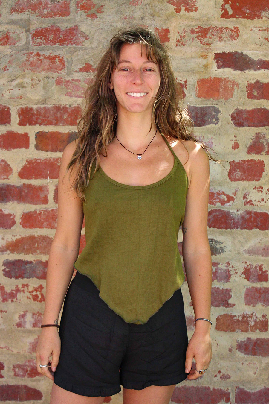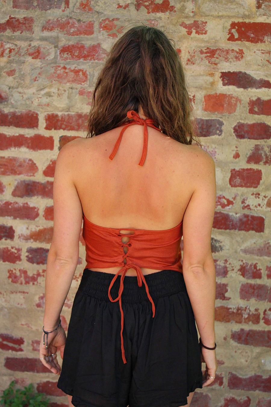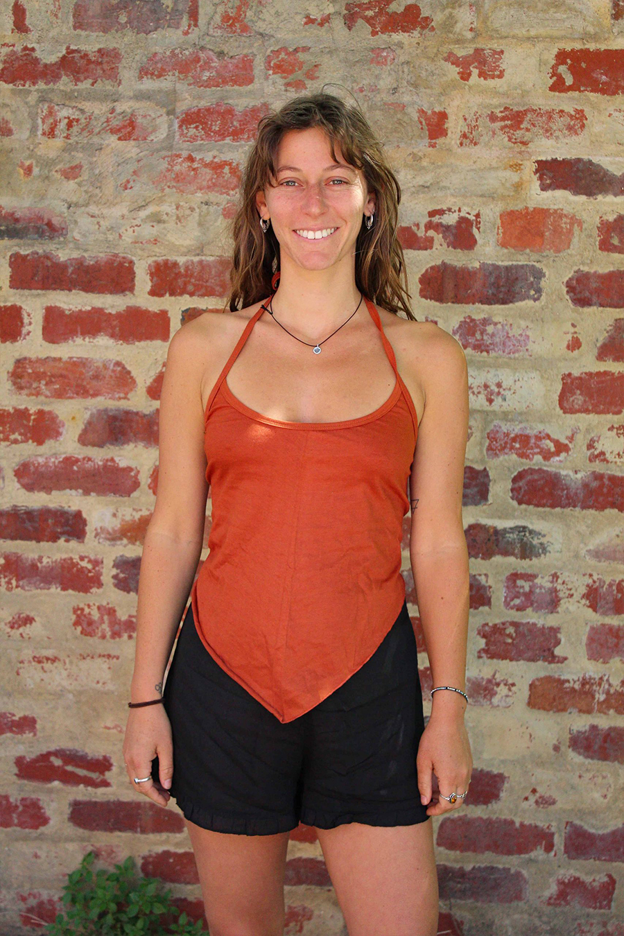 100% cotton singlets with adjustable criss-cross back and halterneck tie-up.