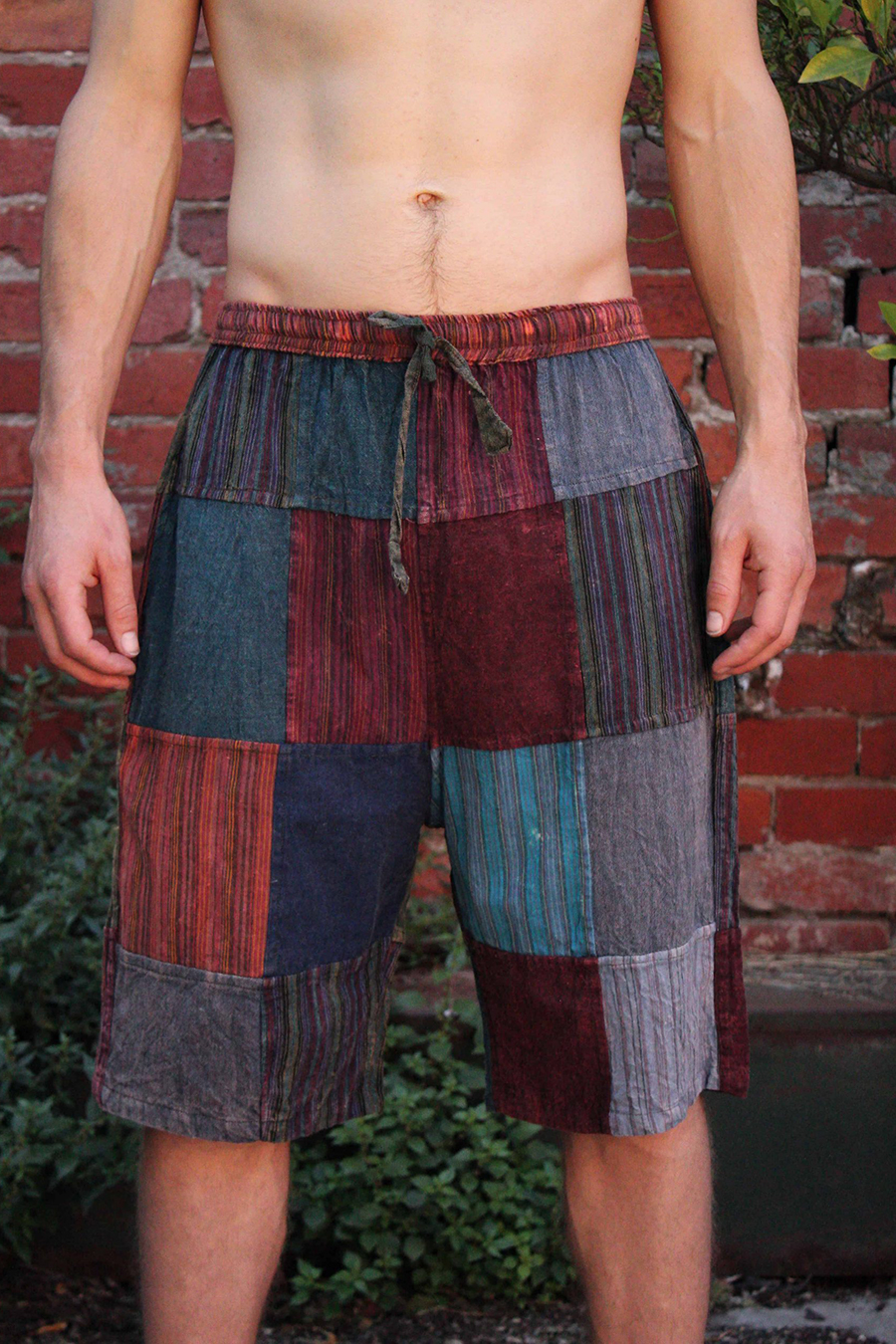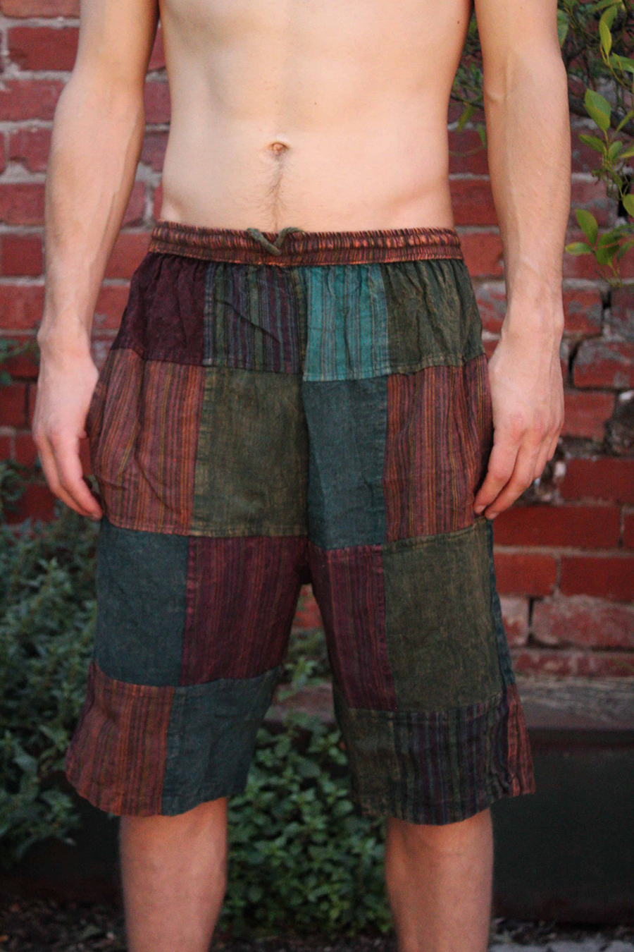 Overdyed cotton patchwork shorts with drawstring waistband and side pockets.