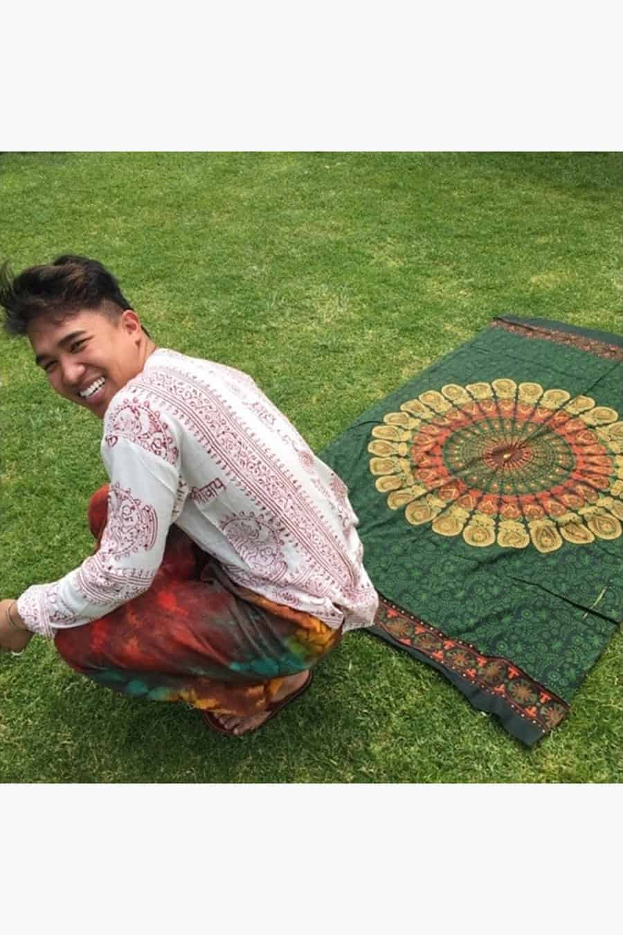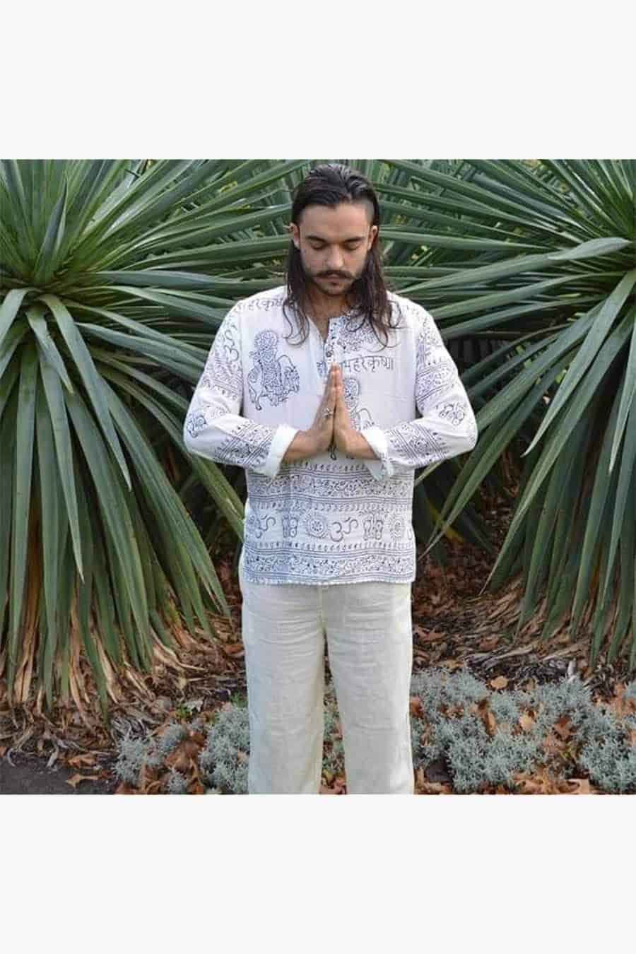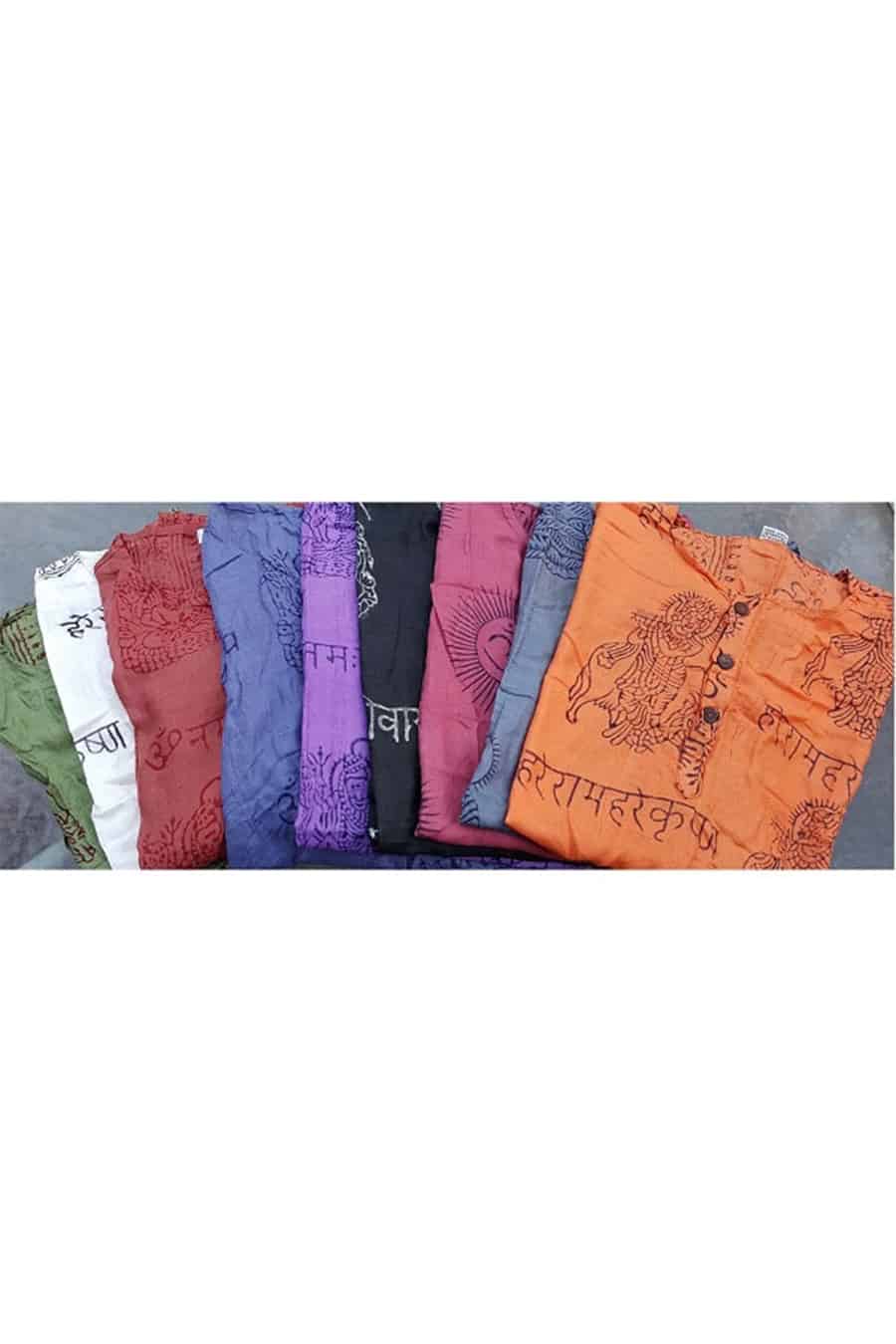Loose fitting shirt made from temple sarong. Round collar with 3 coconut buttons. Ideal summer or festival wear. Various prints of either Indian Gods or Ohm. Choose between red or black print.